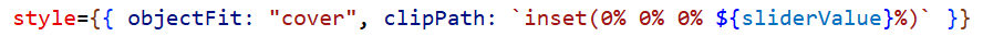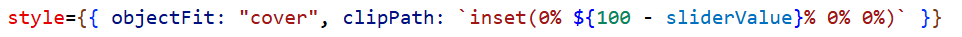 For the top code, as the slider moves from 0 to 100, the right side gets less and less cropped which reveals more of the picture. In the bottom code, this one hides more from the left as the slider increases, doing the opposite of the first image. So one image is revealed from left to right, and the other from right to left. When they’re stacked perfectly on top of each other, the visible areas are like opposites and one fades in as the other fades out.